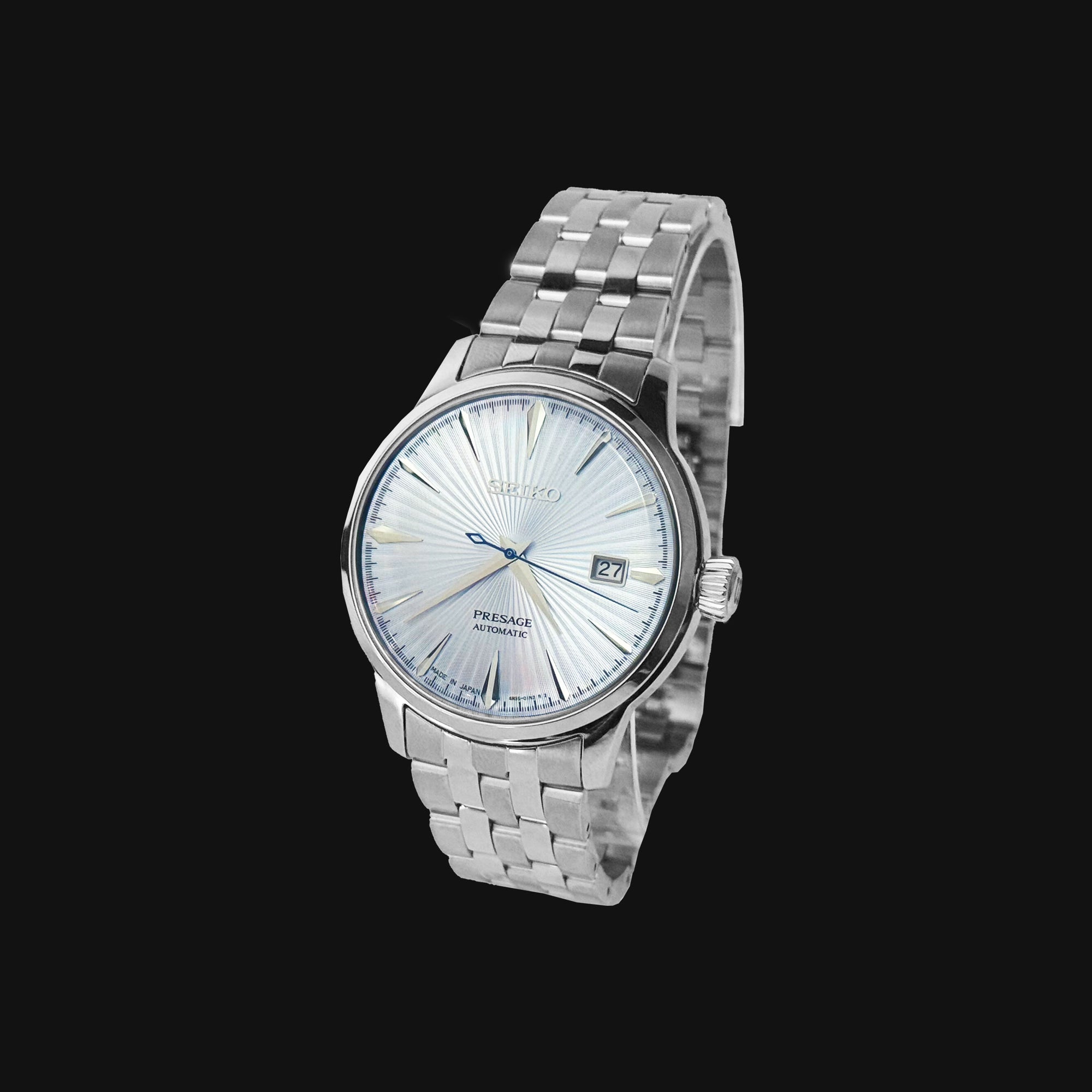 Élégance intemporelle et raffinement japonais. La Seiko Presage SARY161 dévoile un superbe cadran bleu ciel texturé inspiré des cocktails artisanaux de Tokyo. Son mouvement automatique 4R35 offre une réserve de marche de 41 heures, visible à travers un boîtier en acier inoxydable de 40,5 mm. Protégée par un verre Hardlex anti-reflet et étanche à 50 m, elle incarne la précision et le charme discret de la collection Presage.
