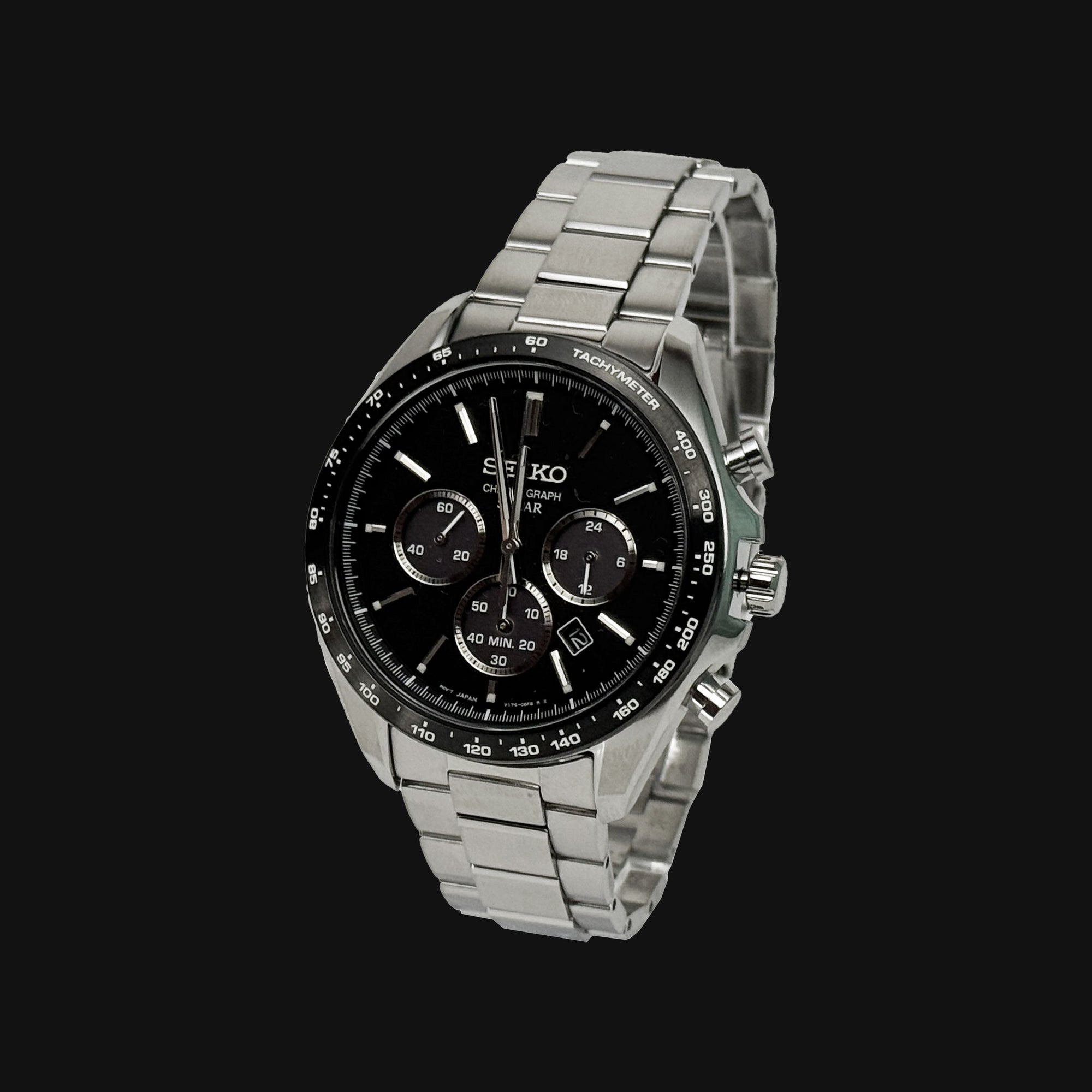 Le cadran noir épuré et le boîtier acier en font un chronographe sérieux, idéal pour un style dynamique.